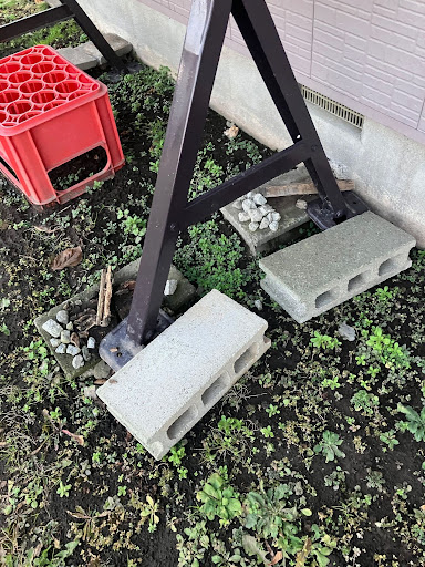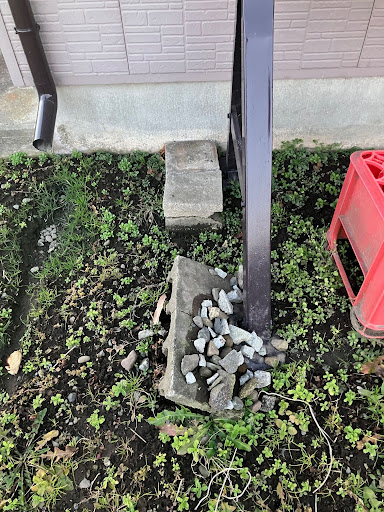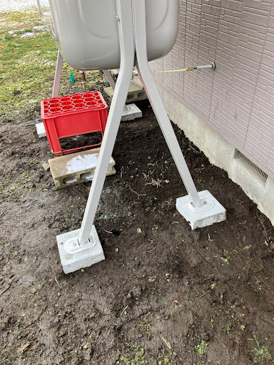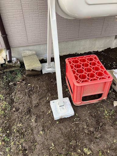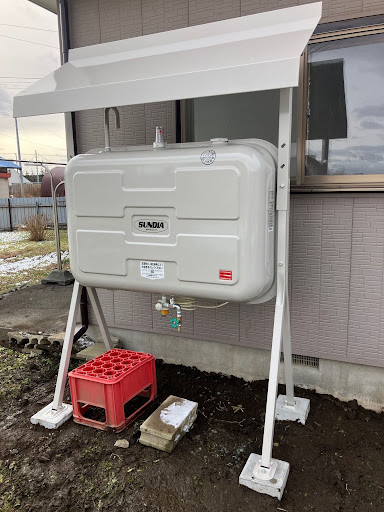 2025年12月8日夜中に震度6強の東方沖大地震が起きました。かなり強い揺れにより、いつも灯油の定期配送を契約してくださっているお客様より、ホームタンクが傾いたので至急直して欲しいとの問合せがありました。弊社で施工したものではありませんでしたが、状況を確認しに向かいました。すると、信じられない事に、地面の上に置いたコンクリートブロックの上に、灯油満タン時には四百キロにもなるホームタンクが、ただ載っているだけのものでした。当然の結果として、地震によって脚が土台からずれて土に埋もれ、全体が傾いてしまい、危険な状態でした。そこで弊社では、地盤が弱いところを避け、改めて4箇所に穴を堀り、砂利で固めて束石を設置。タンクの脚部分を束石にアンカーボルトで固定する作業を行い、大きな地震にも揺らがないよう設置し直しました。